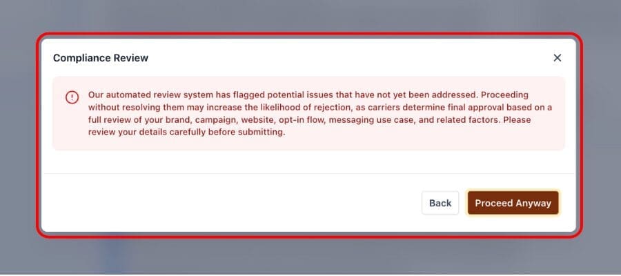 And here’s the key part: while the compliance scan is required to complete the campaign submission process, you’re not forced to fix every issue. You can still submit at your own risk—but now you’re doing it with your eyes open.