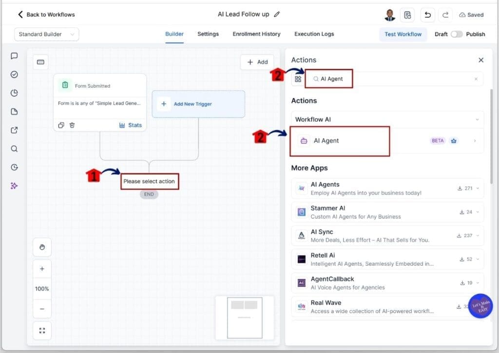 Setting up AI lead follow-up in GHL is done inside the Automations area using a workflow. You will connect a form submission trigger to an AI Agent action so your system can respond to new leads automatically.