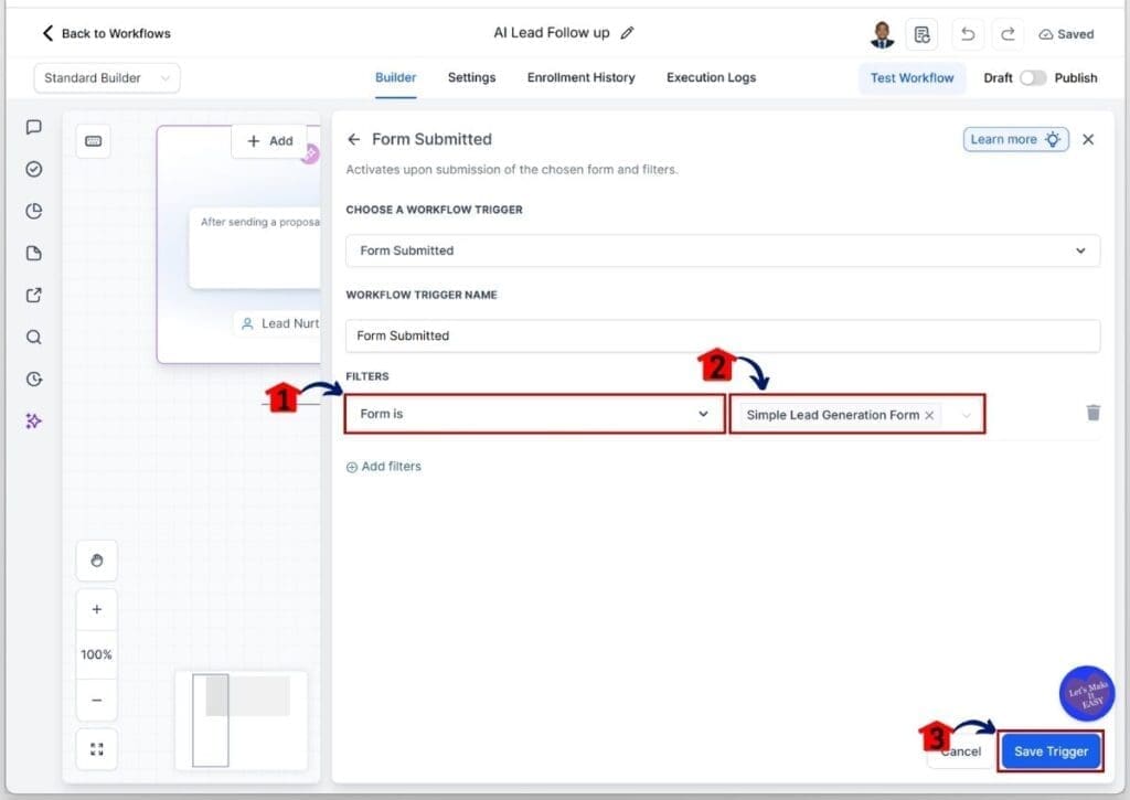 This process ensures every form lead is handled the same way each time. You will configure the trigger, apply the right filters, and set up the AI Agent to manage replies, assignments, and pipeline updates. Here are the steps to build and publish your AI lead follow-up workflow in GoHighLevel.