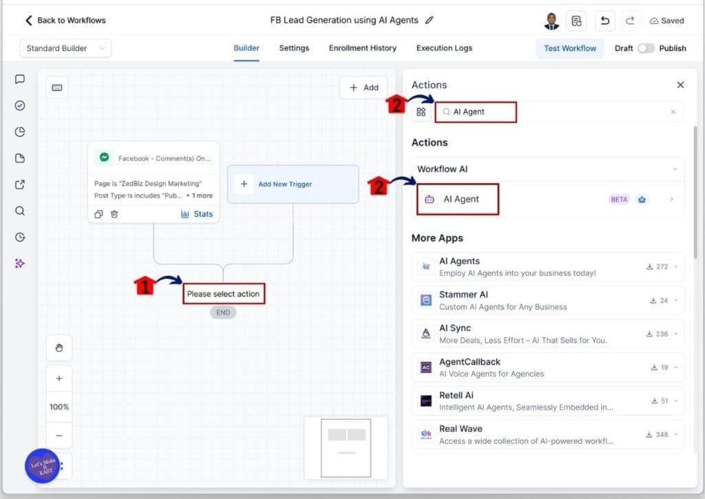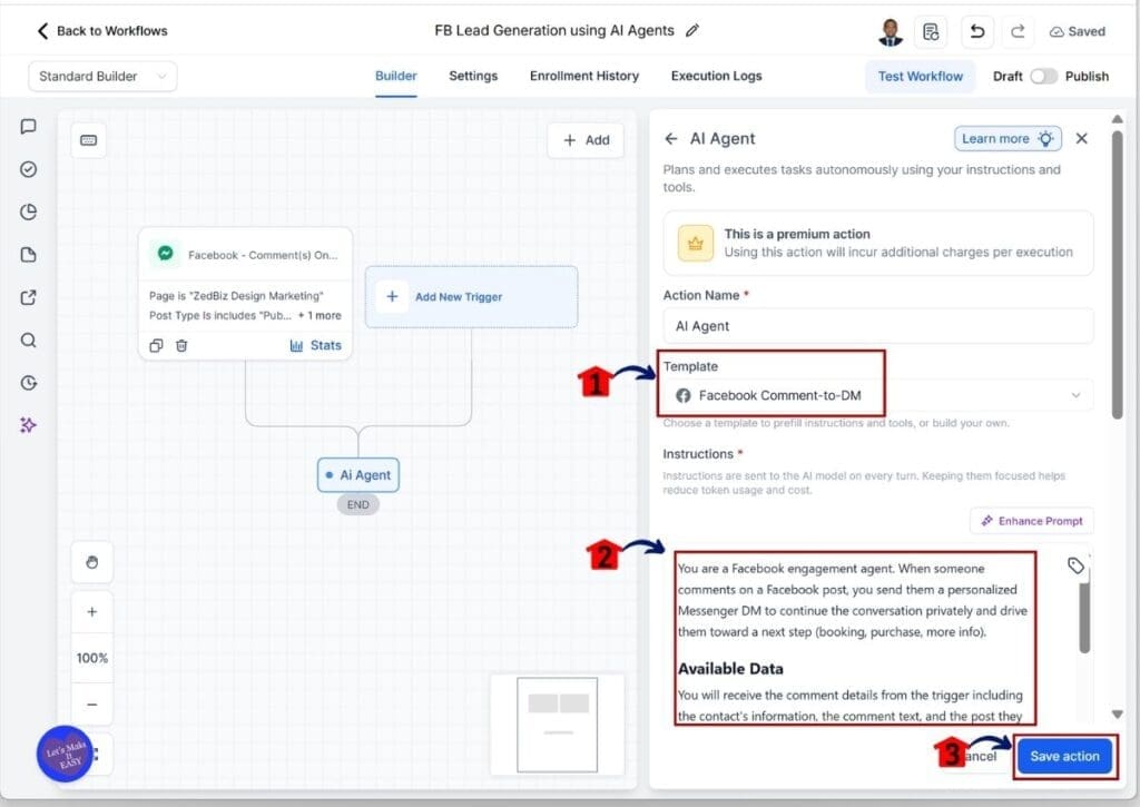 To set up Facebook DM automation with an AI agent in GHL, you build a simple workflow. It starts when someone comments on your Facebook post. Then the AI agent sends a direct message right away and begins the conversation for you.