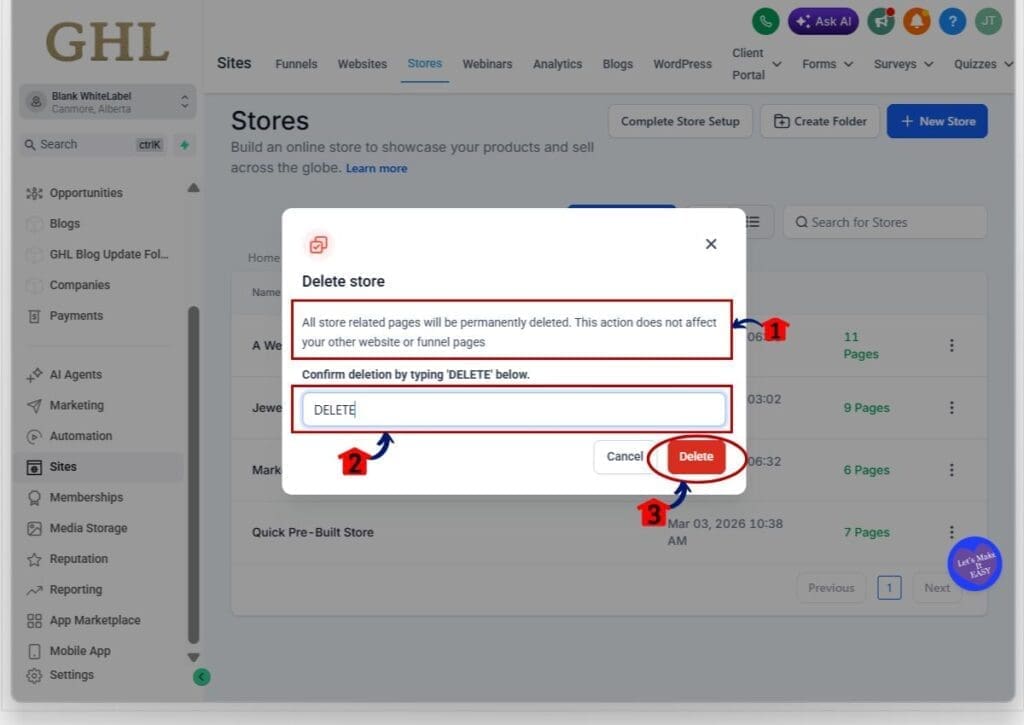 Delete Store is done inside the Stores area under Sites. You will open the Stores list, choose the store, open the action menu, and confirm deletion by typing DELETE. The new confirmation message also makes it clear that only store pages will be removed, not your main website or funnel pages.