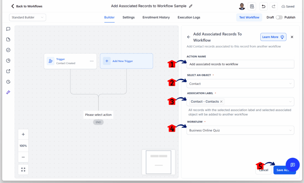 After this, any time the main workflow runs, GoHighLevel will find the associated records and enroll them in the workflow you selected. This lets users build logic that goes beyond a single contact and brings other connected records into the automation without extra effort.