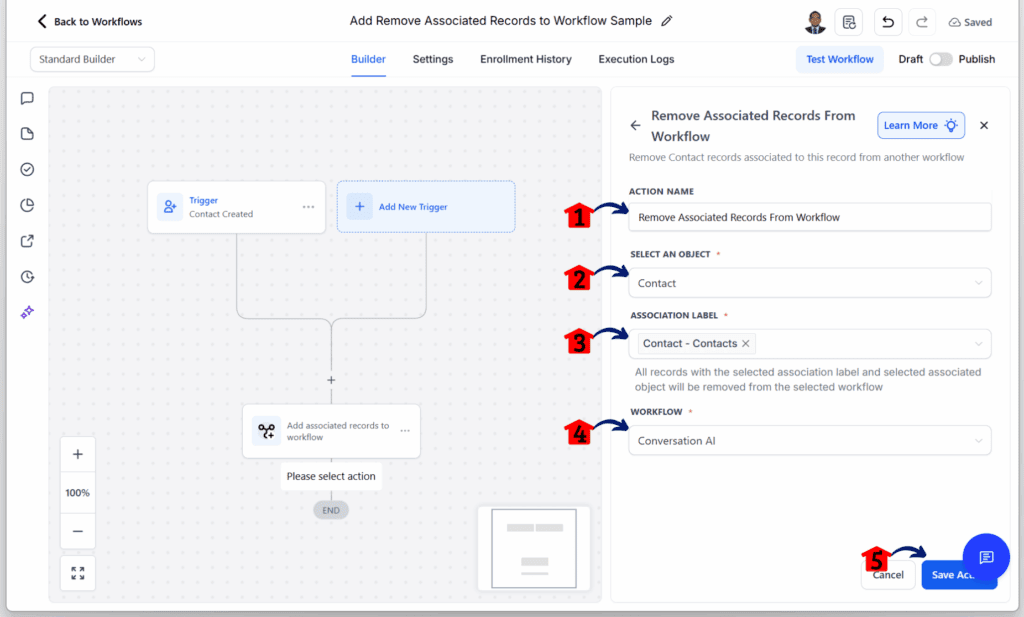 With this setup in place, GoHighLevel will handle the rest. When the workflow runs, it will automatically remove the associated records from the selected workflow. This is a direct and reliable way to apply associated records automation without needing manual cleanup.