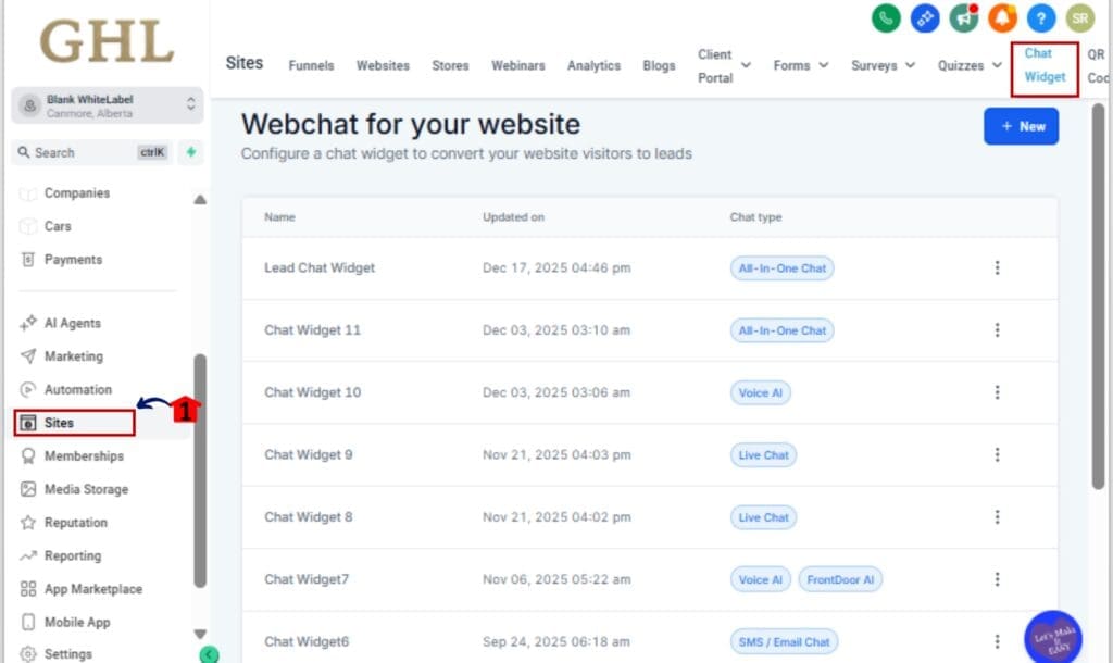 1.1 From your GHL sub-account, go to Sites in the left-hand menu