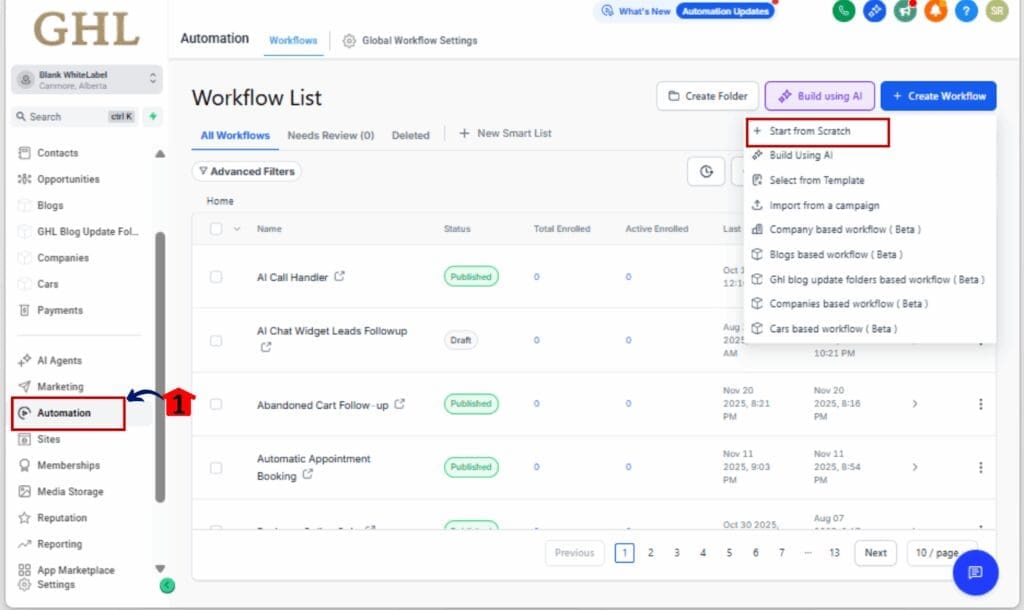1.1 In your GHL account, head to the left menu and click Automation, then Workflows.
