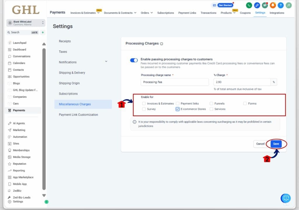 GoHighLevel now includes a processing fee checkout setting for Ecommerce stores. You’ll find it under Payments → Settings → Miscellaneous Charges.
