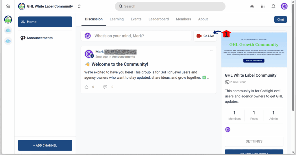 Running live streaming communities inside GoHighLevel is easy. Everything happens inside the platform, so there is no need for extra software or accounts. Here is how to go live from a GHL community group: