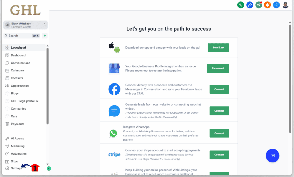 Step 01 – Access the Settings Area in GoHighLevel