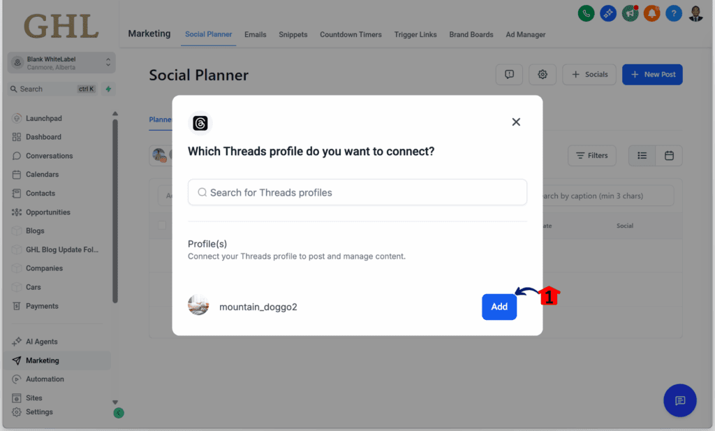 Setting up Threads inside GoHighLevel is simple. If you’ve connected other platforms in the Social Planner before, this will feel familiar. The process only takes a few steps and uses your Instagram login.